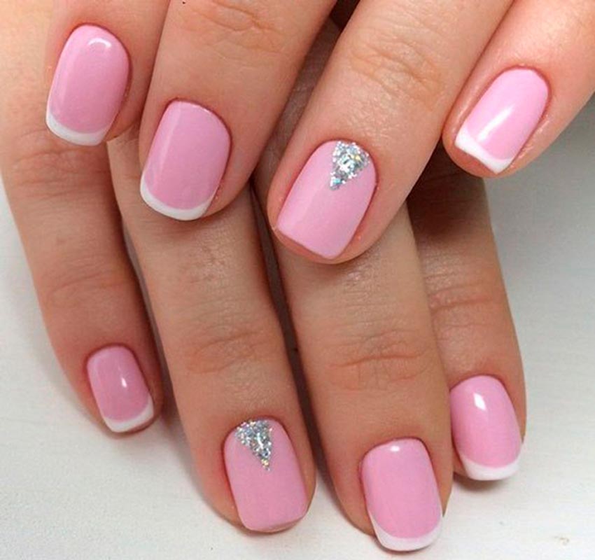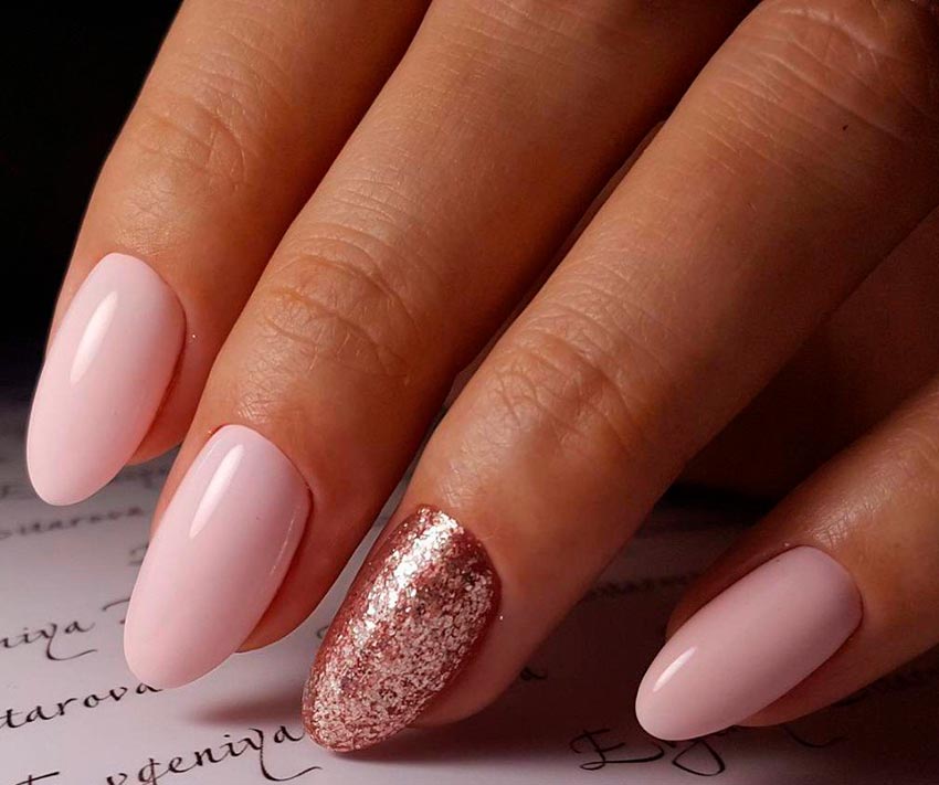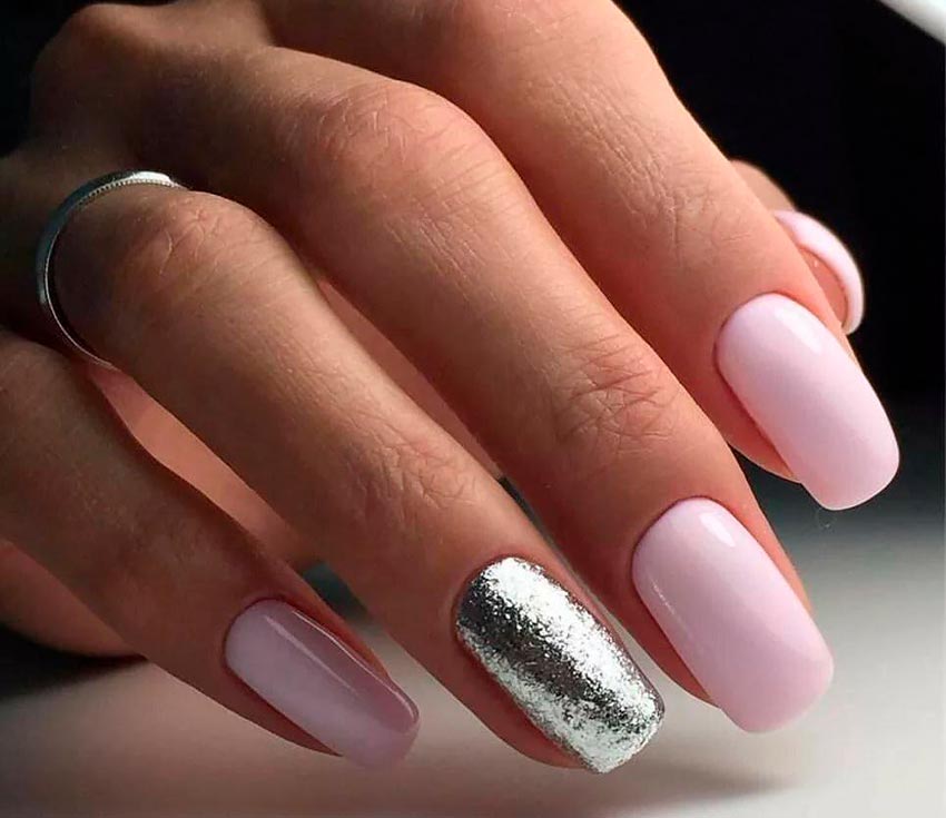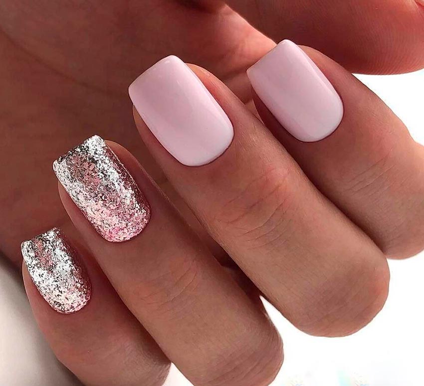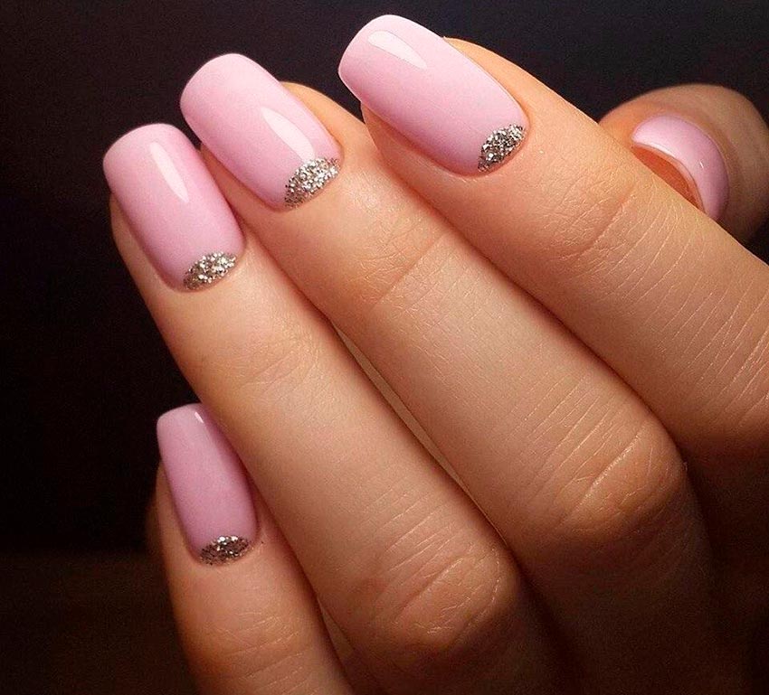 L'or convient moins au rose, il vaut la peine de l'utiliser si vous portez des bagues en or jaune sur vos mains. Et oui, les tons vifs de rose, néon ou fuchsia auront l'air assez vulgaires avec des paillettes. Par conséquent, choisissez des couleurs pastel claires.