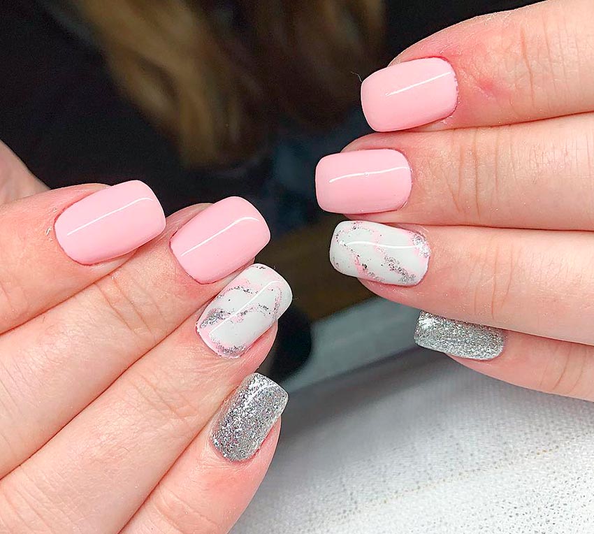 Si vous souhaitez obtenir une manucure lunaire avec des nuances claires de rose, utilisez des paillettes. Après tout, vous pouvez recouvrir l'ongle d'un vernis rose délicat et dessiner le trou dans une autre couleur, ou encore mieux avec des paillettes. Dans l'ensemble, le rose se marie bien avec les textures scintillantes, en particulier l'argent.
