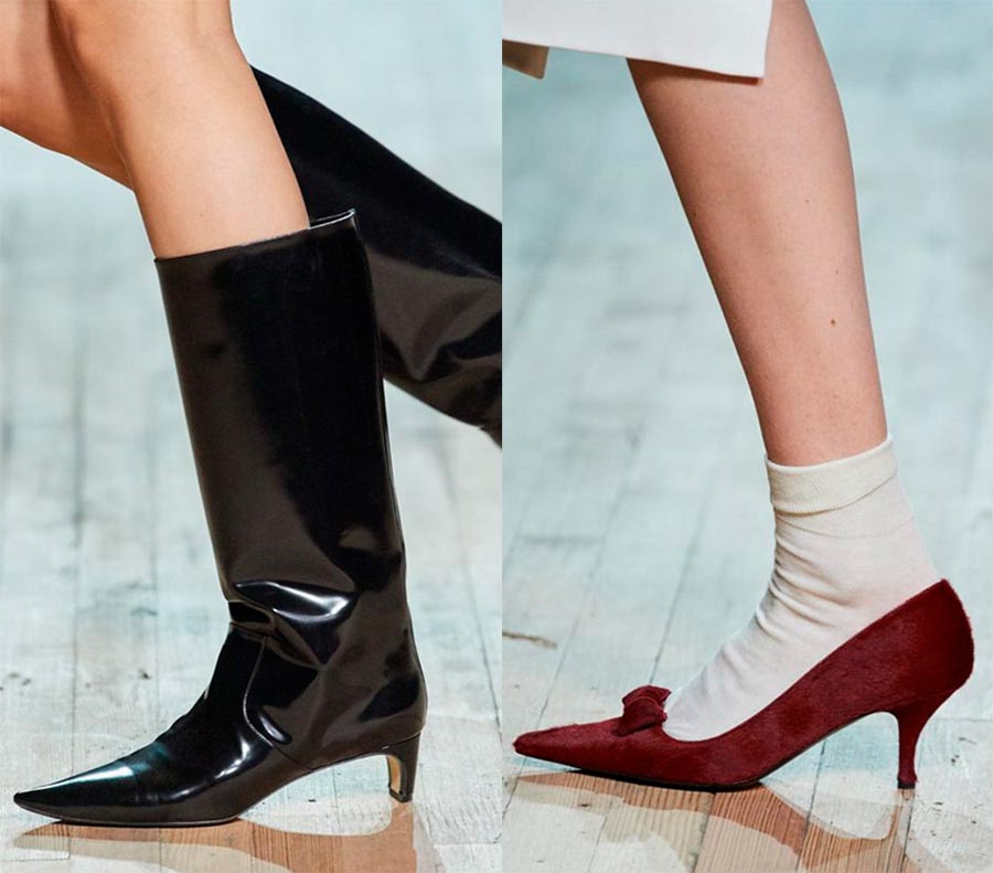 Petit talon bas avec un verre. Pas tout à fait typique, mais à la mode, le talon incurvé des chaussures de la marque Khait donne le ton. Il existe de nombreux modèles avec de tels talons dans les collections des marques By Far, Massimo Dutti, Christian Louboutin, Aquazzura, Altuzarra. Mango propose des bottines à talons kaki kaki assorties aux leggings et pantalons en cuir. Les bottines en daim H&M sont basiques et polyvalentes. Règle du modèle - talons jusqu'à 4 cm Cette saison peut être colorée et même avec un bout carré.