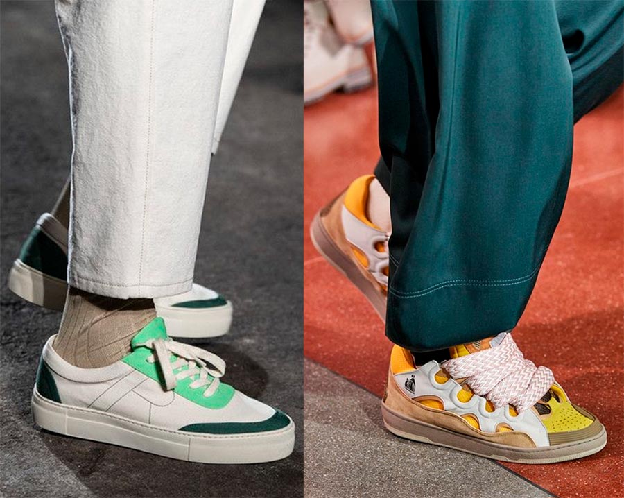 Les baskets sont vraiment plus plates, les modèles massifs sur les podiums sont de plus en plus petits. Certaines marques jouent avec le laçage et la décoration sur les sneakers.