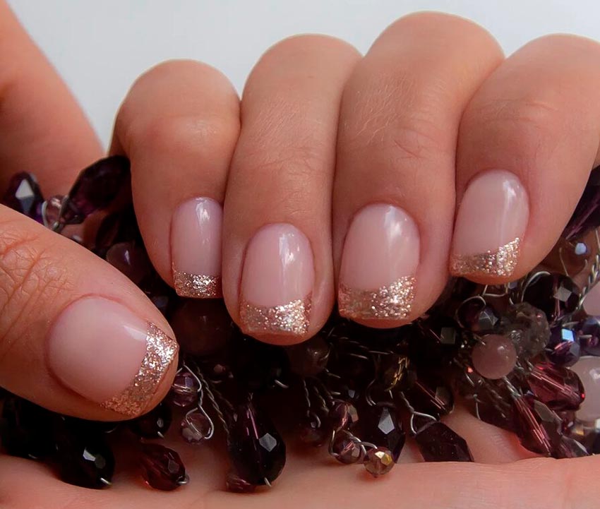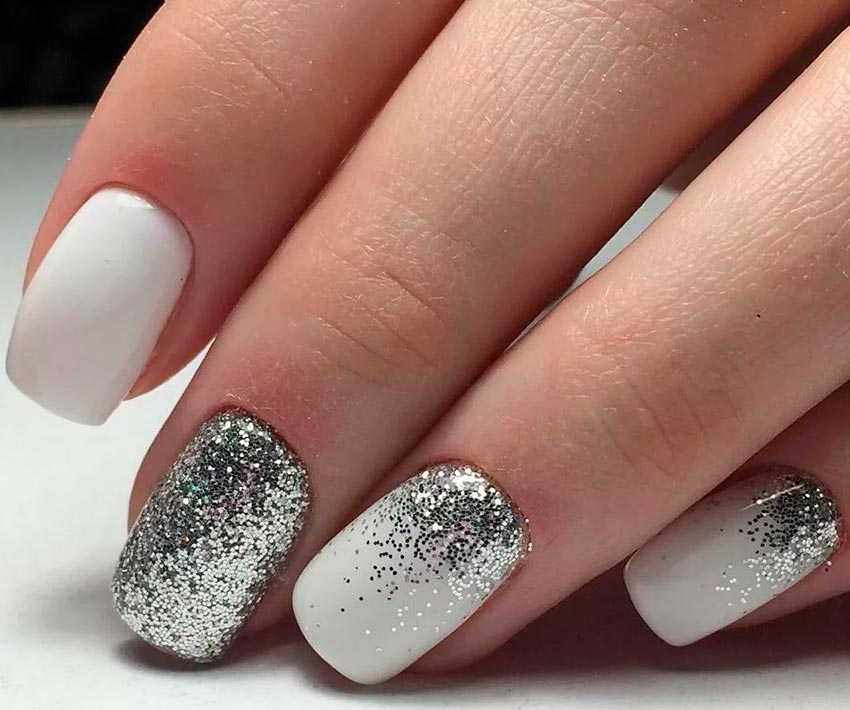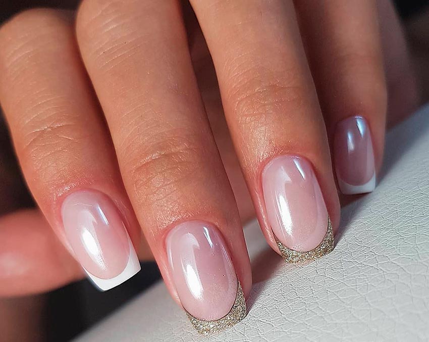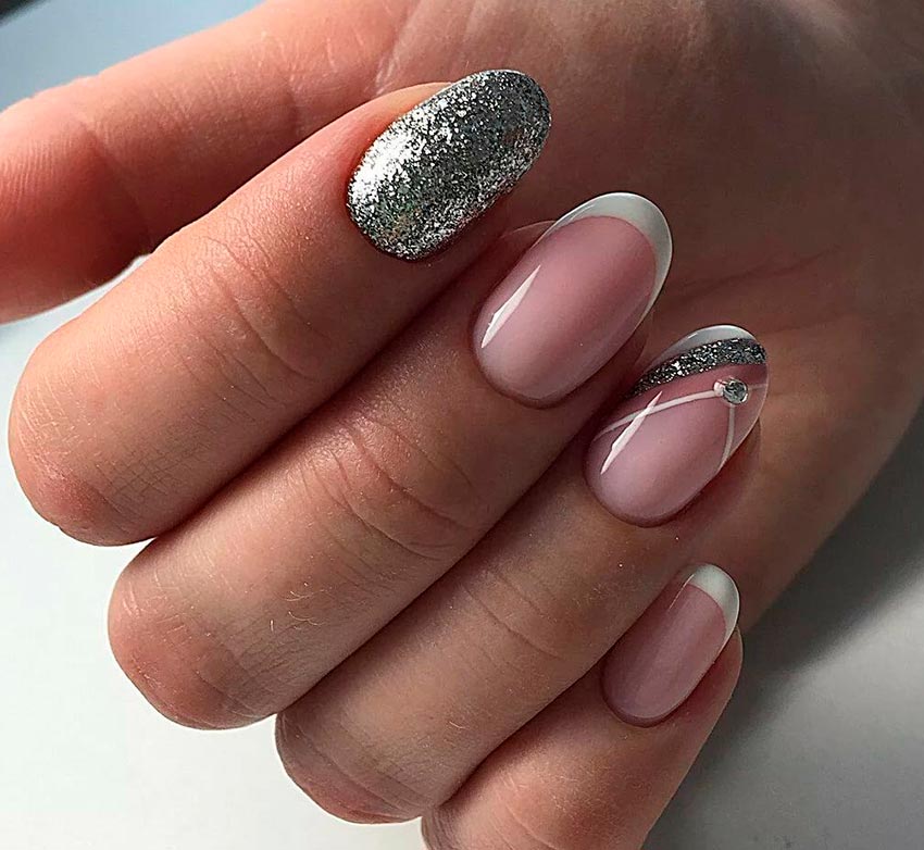 C'est pour les fans des classiques, mais si la veste traditionnelle en a déjà marre ou si vous voulez ajouter de la fête pour une raison quelconque. La manucure française peut être décorée de paillettes à votre guise, l'essentiel, encore une fois, est de ne pas en faire trop avec une abondance de décor étincelant. Une bonne option est une veste classique sur une base nude ou transparente, avec un "sourire" blanc et un léger reflet sur le dessus. Choisissez pour ces revêtements transparents avec un chatoiement dans une teinte argentée - il aura l'air mieux sur le blanc.