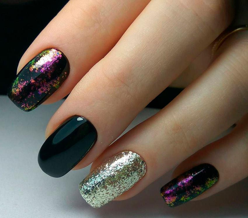 Il existe des variantes avec une brillance contrastant avec la couleur de base du vernis. Les teintes sombres sont les meilleures : noir, violet, bleu foncé, vert foncé, bordeaux. De petites paillettes chatoyantes de toutes les couleurs de l'arc-en-ciel créent l'effet de la "voie lactée". Plus le chatoiement est petit, plus il peut être utilisé, même en s'appliquant sur tous les doigts. Si les paillettes sont plus grosses, appliquez-les sur un ou deux doigts et assurez-vous que le vernis de base sur les autres ongles correspond à la couleur.