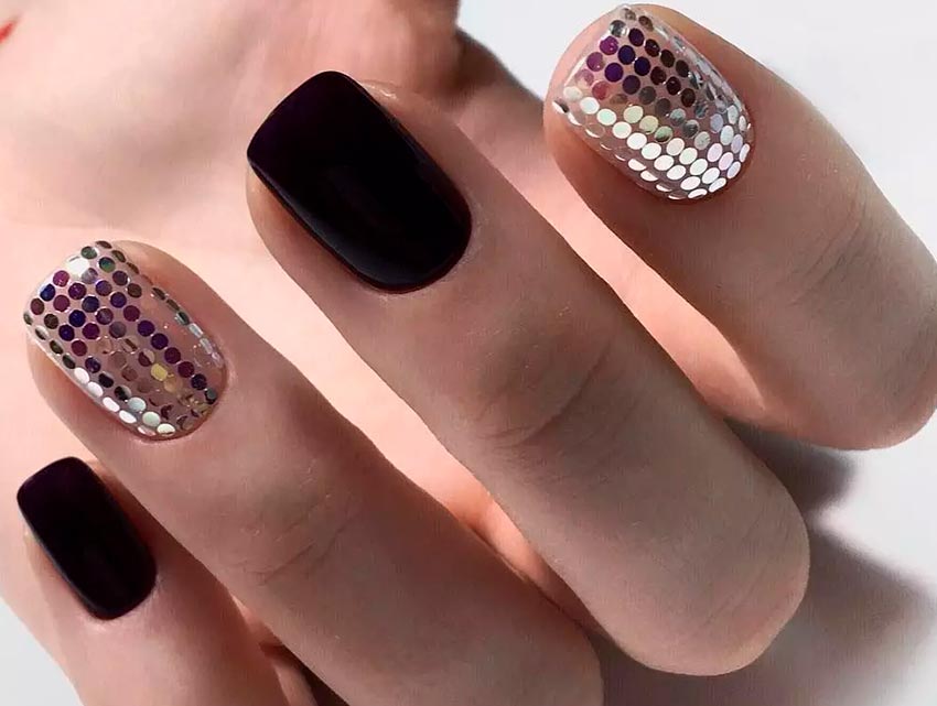 Les paillettes de toutes les nuances ont fière allure sur les vernis clairs, et pour les plus sombres, il est préférable de choisir des paillettes contrastées et claires pour qu'elles soient visibles. L'option la plus populaire aujourd'hui consiste à étaler des paillettes à la base de l'ongle, près de la cuticule. Ils peuvent être disposés un à la fois, ou plusieurs, en s'étirant jusqu'au bout de l'ongle. N'oubliez pas que lorsque vous utilisez de l'or ou de l'argent, ces paillettes doivent correspondre à la couleur des bijoux que vous portez sur vos mains.
