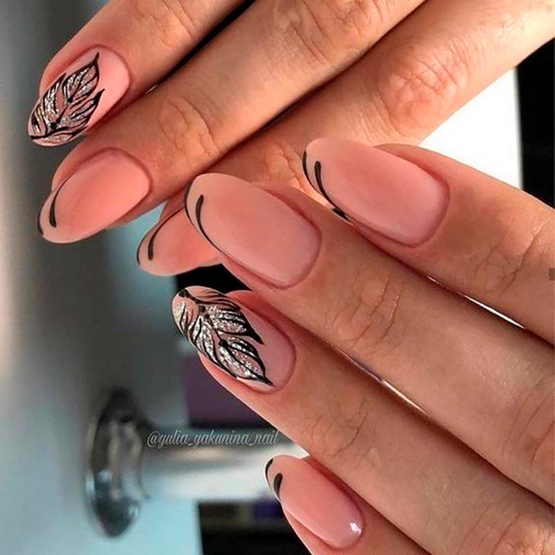 Une autre option de manucure très discrète, sophistiquée et élégante est la peinture à paillettes. Dans ce cas, vous aurez certainement besoin d'un gel liquide pailleté d'une fraction assez fine, ainsi que d'un pinceau fin pour les dessins. Que dessiner ? Peu importe, l'essentiel est que cela soit fait de manière très subtile et précise. Par conséquent, il est préférable d'effectuer une telle manucure avec un maître expérimenté dans le salon afin qu'il ne semble pas qu'une écolière l'ait fait. Une belle peinture convient à une femme d'affaires si elle est réalisée sur une base nue ou claire.