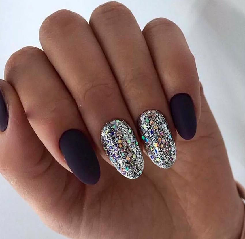 Les paillettes, les paillettes et les motifs scintillants les plus brillants et les plus contrastés ont bien sûr l'air d'un fini mat. Le brillant des paillettes n'est pas distrait par l'éclat brillant du vernis lui-même. Cette option est parfaite pour des vacances ou une soirée de gala. La couleur de base du vernis peut être n'importe laquelle. Les teintes nude claires ou pastel sont les meilleures, ainsi que les plus saturées : bleu, vert, fuchsia, violet et même noir mat.
