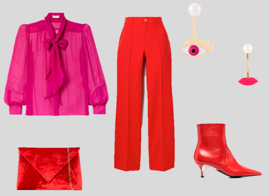 La combinaison de couleurs analogiques est agréable à l'œil. Une blouse fuchsia et un pantalon rouge ne sont pas une combinaison pour tous les jours, mais pour les vacances.