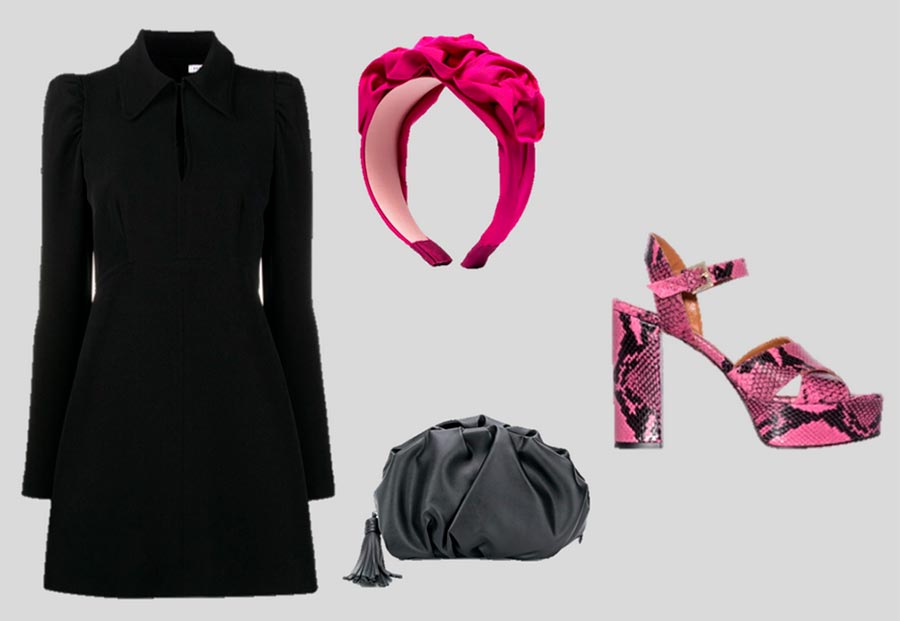 Une petite robe noire modeste a l'air exagérément infantile, rien n'a besoin d'être renforcé. Un large bandeau fuchsia et des sandales à plateforme accentuent le look.