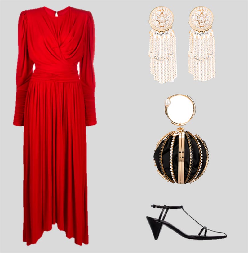 Robe longue rouge sans vulgarité agressive et sexualité pour une femme adulte de statut. De belles boucles d'oreilles week-end et une pochette à billes moderniseront le look pour qu'il ne fasse pas grand.