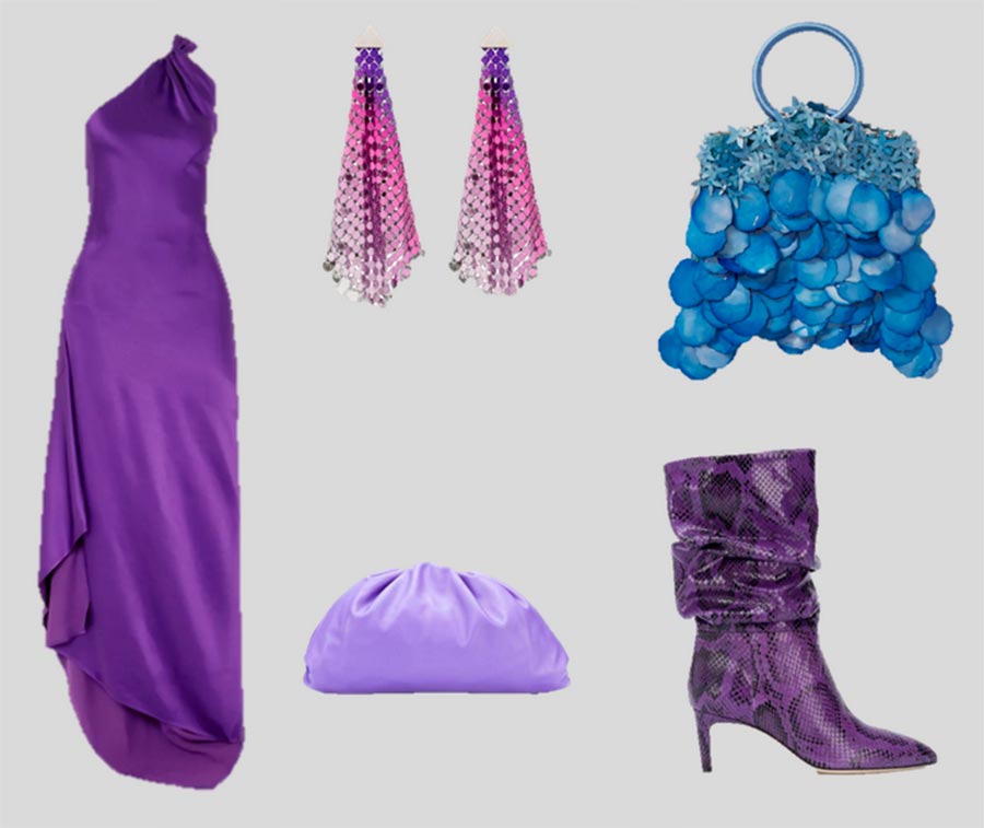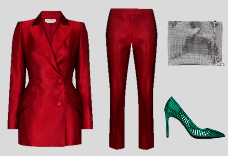 Un tailleur-pantalon rouge, des escarpins verts jouent le contraste, un sac à main argenté brillant est une image pour une fille qui veut se démarquer et avoir l'air chic.