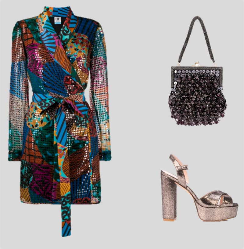 Robe portefeuille à sequins associée à des bottes trompettes qui rabattent la robe et à une pochette en fausse fourrure. Le sac poudré ajoute une touche d'espièglerie et de féminité. Peut être combiné avec des collants, y compris en maille ou brillant.