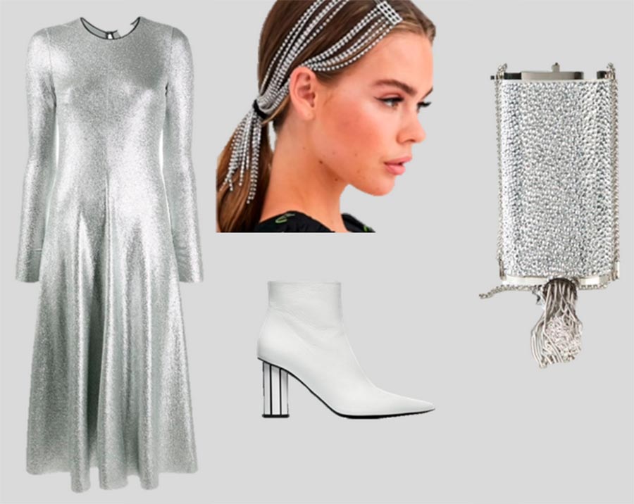 Une robe en satin gris à manches longues et des ornements de cheveux inhabituels est magnifique. Les bottines blanches sont parfaites pour les looks du Nouvel An.