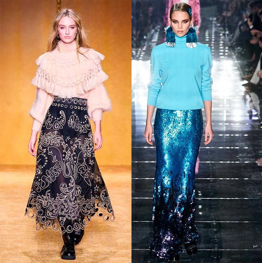 Jupes. Des tissus luxuriants ou volants ajouteront de la féminité à l'image. Le plissage est toujours en vogue, une tendance polyvalente pour presque tous les styles, du sportif au classique. A noter également les modèles asymétriques, avec une enveloppe et une coupe haute. On choisit une jupe de longueur moyenne ou maxi, et des débordements nacrés et métalliques, des paillettes, des plumes, des franges viendront ajouter à l'ambiance festive.