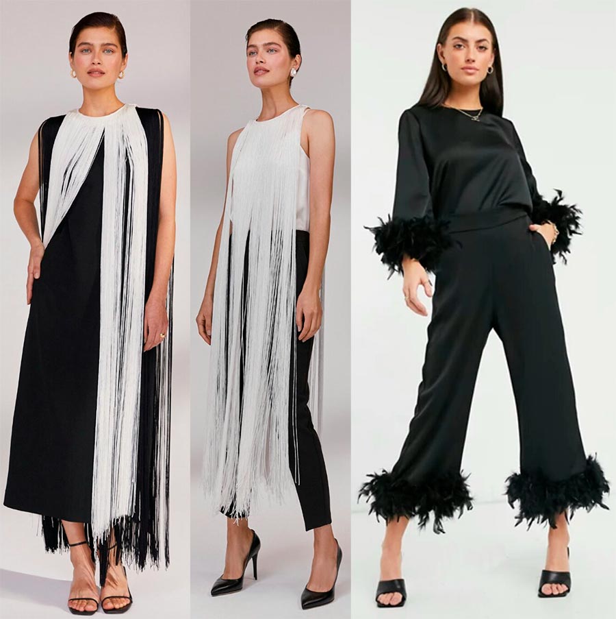 7. Plumes, paillettes, franges - si l'âme le demande, il y aura une fête. Robes, costumes ou hauts. A la fois entièrement en plumes et en décoration. Les paillettes sont généralement le plus souvent associées au Nouvel An, elles peuvent donc être partout. Et la frange est à la mode en ce moment : si vous êtes à la mode le soir du réveillon, vous serez à la mode toute l'année.