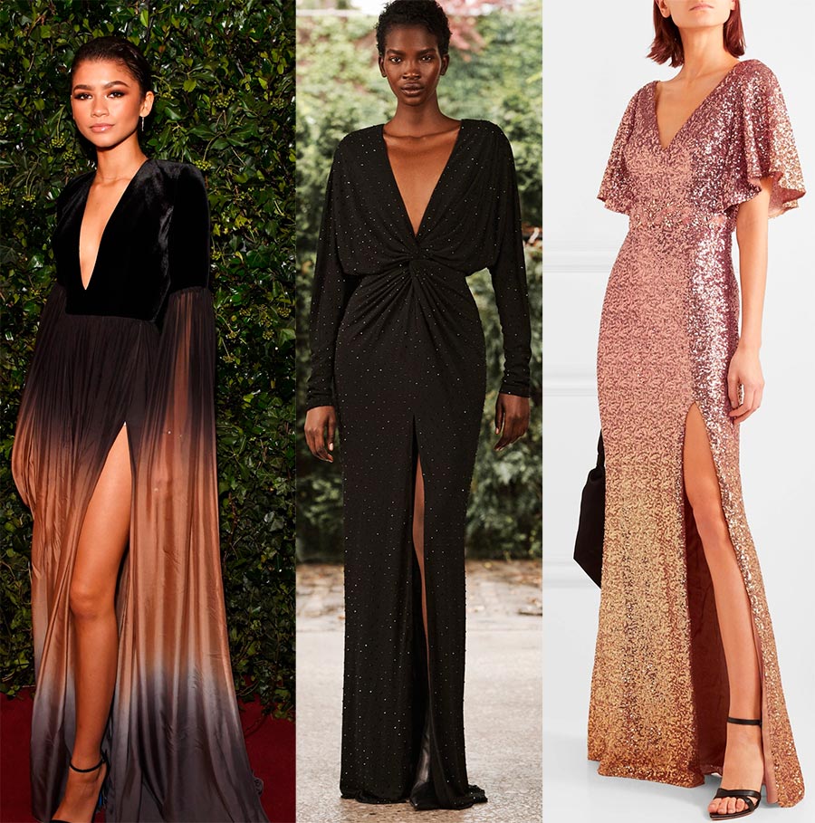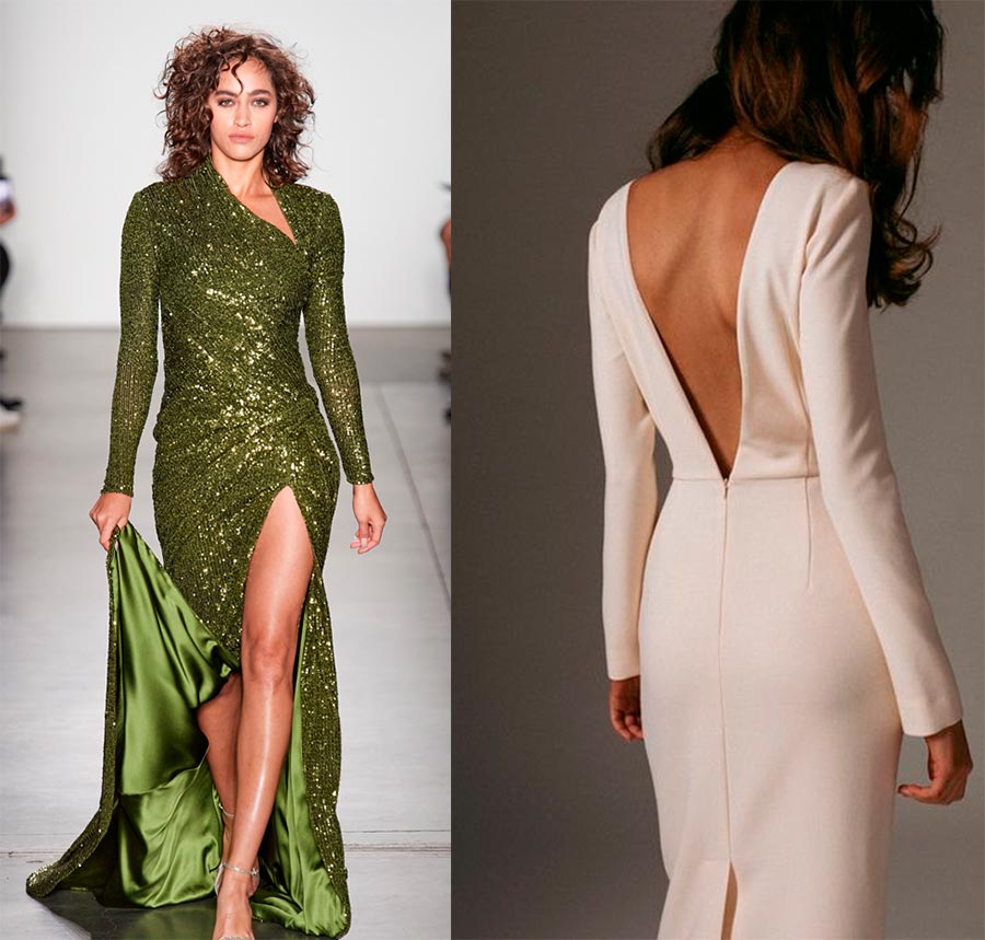 Un décolleté très profond est à la mode. Facultatif dans l'encolure : cela peut être une découpe dans le dos ou une coupe spectaculaire à partir de la hanche sur une robe longue.Un point très important est de ne pas faire d'autres accents dans l'image. La découpe est autonome et ne nécessite aucun support. En surchargeant la tenue de décorations et de décors inutiles, vous risquez de perdre tout le charme de l'image : le décolleté symbolise l'insinuation et suscite l'intérêt, et tout détail supplémentaire peut tuer l'ensemble du concept.