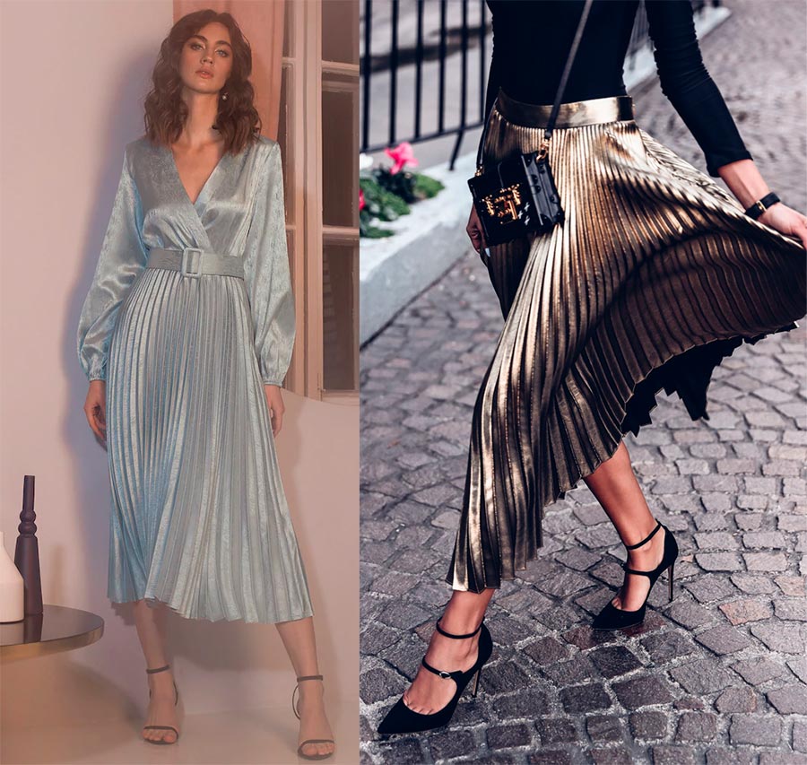 Le plissage ajoute toujours de la tendresse et de la féminité à l'image. Pour un look de nouvel an, privilégiez une robe plissée aux reflets métalliques : elle apportera de l'élégance. Choisissez la longueur du midi, c'est la plus pertinente. Il peut s'agir non seulement d'une robe, mais aussi d'une jupe, associée à un chemisier translucide léger et à des manches volumineuses. Je recommande de choisir une palette pastel délicate pour souligner la légèreté et l'ambiance festive.