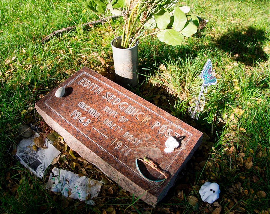 Sa tombe se trouve dans le petit cimetière d'Oak Hill en Californie. Sur la pierre tombale se trouve la modeste inscription : "Edith Sedgwick Post - Wife of Michael Brett Post, 1943-1971".
