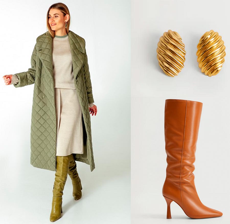 Les vêtements d'extérieur peuvent avoir une couleur kaki, et des chaussures, un sac, une ceinture peuvent avoir une couleur caramel. Les teintes kaki se marient parfaitement avec bijoux en or.