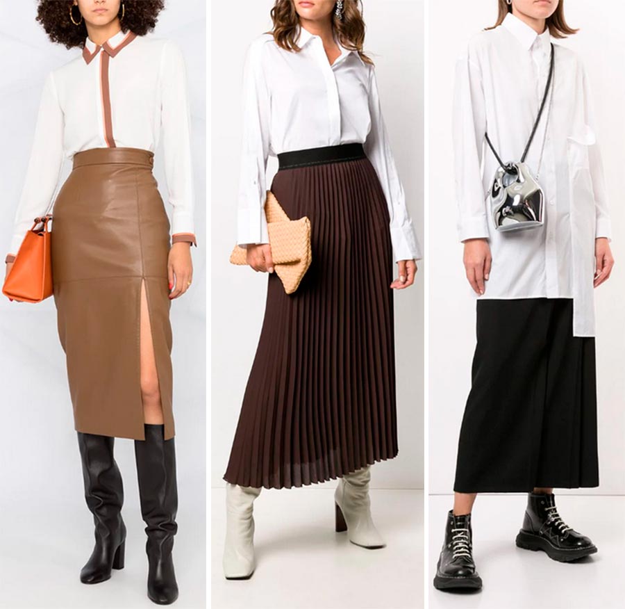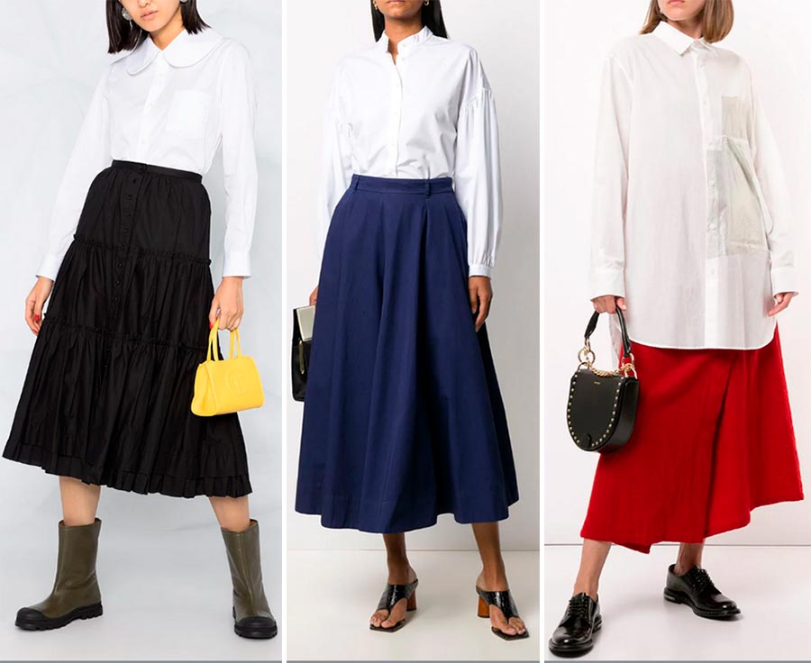 Une jupe complète avec un chemisier blanc n'a pas besoin d'être une coupe de base classique. Les chemises standard de Givenchy, Yohji Yamamoto peuvent être associées à des jupes découpées, des jupes plissées dans des tons neutres ou une jupe longue droite.
