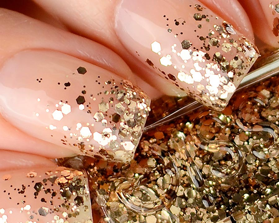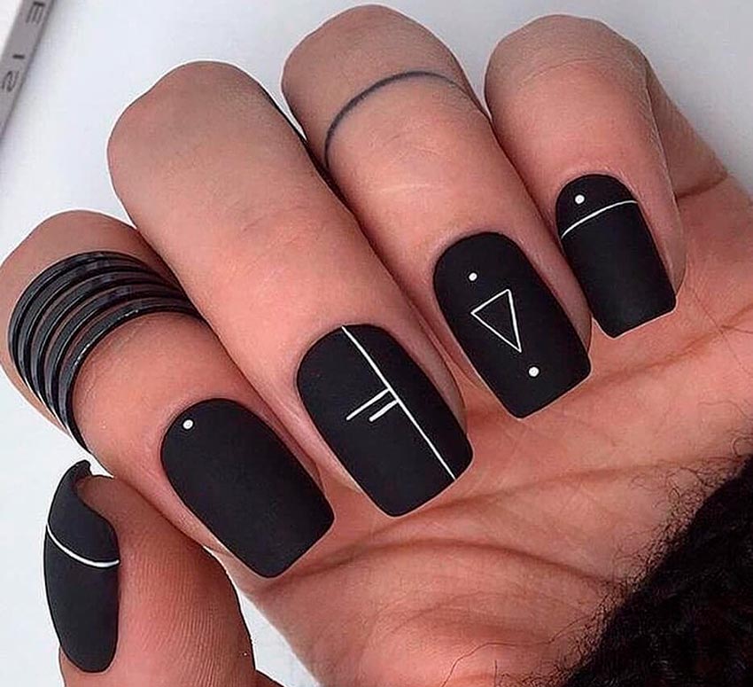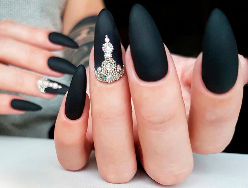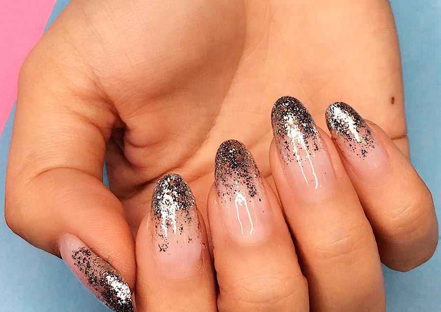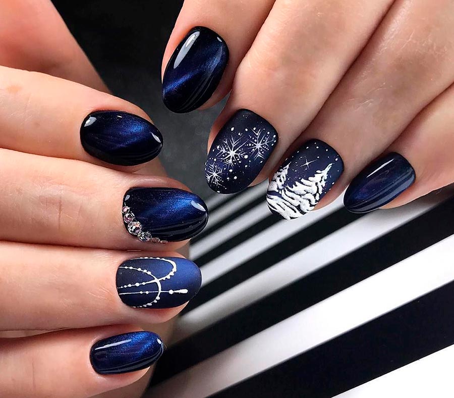 Le noir est également l'une des couleurs les plus populaires pour célébrer la nouvelle année. Et encore mieux, si le vernis noir ou le vernis gel sera avec un chatoiement - de petites étincelles irisées qui rendent une manucure noire moins sombre et ajoutent de la brillance. Le noir est tout aussi avantageux en combinaison avec l'or et l'argent. N'oubliez pas que la couleur des paillettes dépendra des bijoux que vous portez. Si elles sont en métal blanc, optez pour des paillettes argentées. Si du jaune - bien sûr, de l'or. Vous pouvez également choisir des paillettes scintillantes colorées si vous avez des bagues et des chevalières avec des pierres colorées sur vos mains.