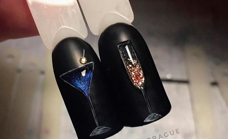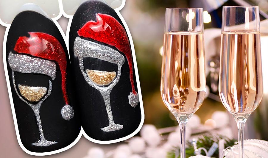 En général, sur les ongles du Nouvel An, vous pouvez dessiner n'importe quel attirail d'hiver - dans la mesure où l'imagination suffit: boules, arbres, flocons de neige, bonhommes de neige et Père Noël, ornements scandinaves, modèles de tricot, etc. Mais les verres de champagne seront les plus beaux sur les ongles. Vous pouvez faire une telle image vous-même : vous aurez besoin d'un fond solide et de paillettes d'or.