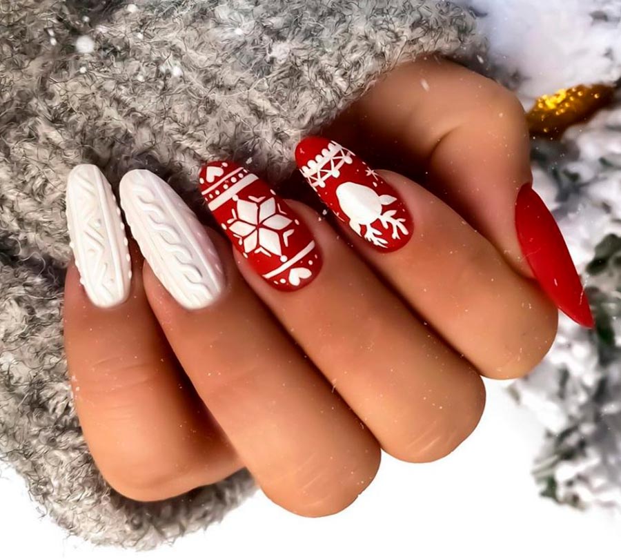 Nous avons répété à maintes reprises que le rouge est devenu un véritable classique. Il y a des femmes qui font de la manucure exclusivement rouge de temps en temps. Il y a ceux qui n'aiment pas les teintes écarlates en raison d'une luminosité excessive. Mais il est très difficile de contester le fait que le rouge est l'un des plus populaires non seulement pour les célébrations, mais aussi pour tous les jours. Eh bien, pour les vacances d'hiver, le rouge sera la couleur la plus du Nouvel An. Surtout si vous complétez le fond écarlate avec un motif en forme de canne en bonbon de Noël ou de boule de Noël blanche.