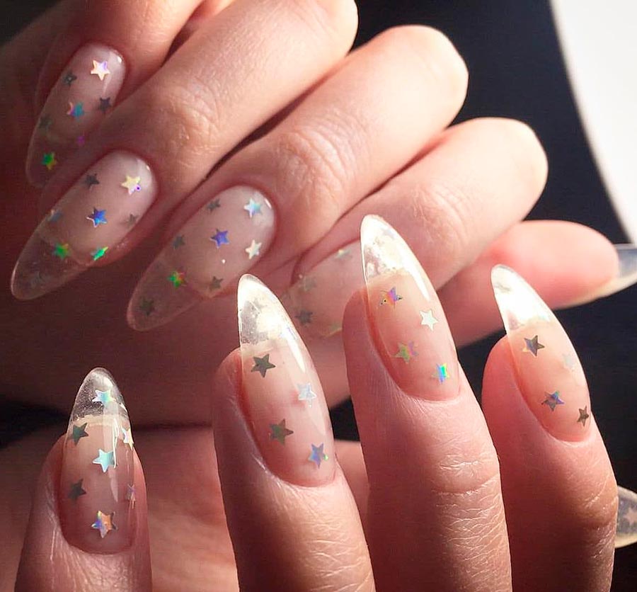 Un chic particulier sera obtenu si vous laissez toute la surface de l'ongle transparente ou si vous faites le "French vice versa" - une manucure lunaire avec un trou de paillettes. En général, il existe de nombreuses options pour une telle conception. Vous pouvez utiliser du papier d'aluminium et du métal pour un "sourire" ou même le rendre flou, sans contours clairs, avec des étirements brillants sur la surface transparente de l'ongle.