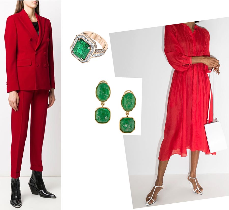 Par exemple:Décorez une veste ou un chemisier rouge avec des bagues et des boucles d'oreilles émeraude.