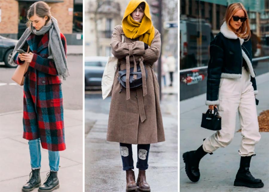 À combiner avec un jean skinny ou droit. Les jeans et pantalons doivent se terminer à la jonction avec les bottes ou aller à quelques centimètres du haut. Eh bien, ces bottes se marient bien avec des robes et des jupes à 10 cm au-dessus du genou. Ces chaussures fonctionnent parfaitement dans une garde-robe d'hiver avec un short en cuir ou avec des collants en laine épais associés à une paire, de taille moyenne et haute - avec des robes et des jupes midi. Avec des jupes et des robes volantes, les bottes de combat fonctionnent en contraste. Avec les jupes-culottes, de telles bottes ont l'air pire, car l'effet d'un squat est créé. Il est préférable de combiner des chaussures à talons avec un pantalon large et court.