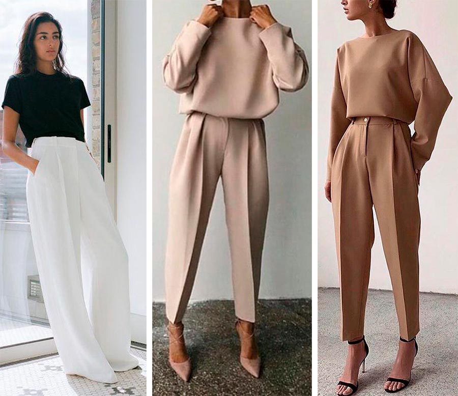 9. Pantalon avec des flèches. Des flèches droites strictes sont capables de réduire le volume des jambes et des hanches, et aussi avec l'aide d'elles, la silhouette est étirée, car les flèches elles-mêmes créent à nouveau une verticale.