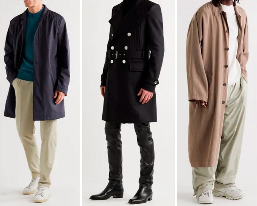 Les trenchs sont une tendance macro, tous les hommes ne sont pas non plus prêts à se décider pour l'achat d'un imperméable, mais un simple trench bleu foncé, sans coupe complexe, peut convenir aux conservateurs. Un trench-coat noir sous une ceinture avec un pantalon en cuir sera élégant et un peu provocant. L'image avec une longue cape volumineuse sera très provocante.