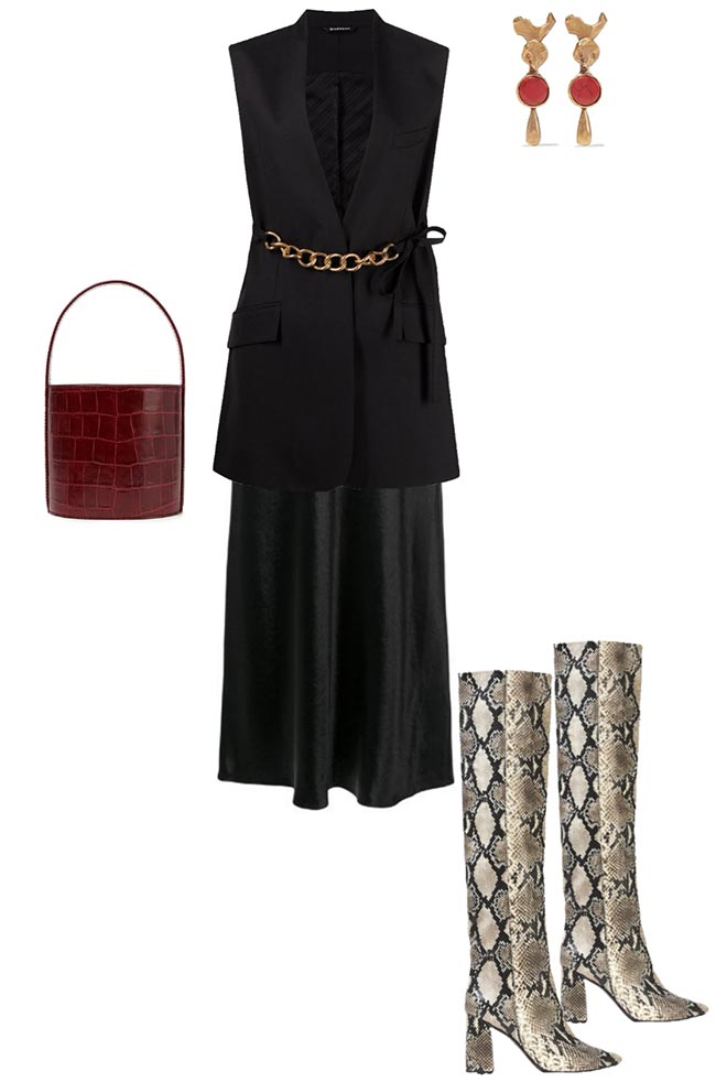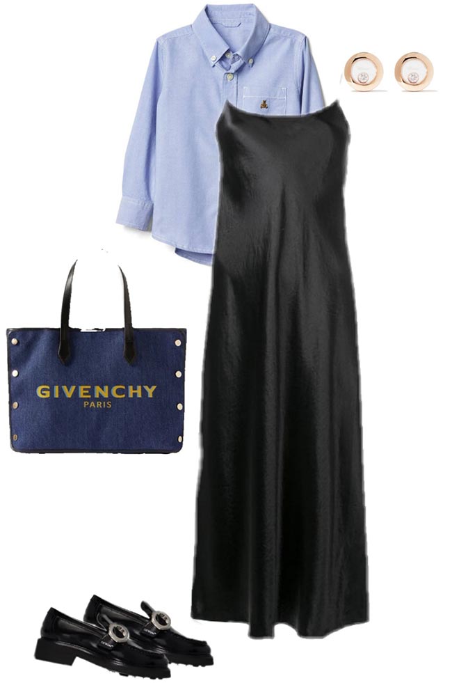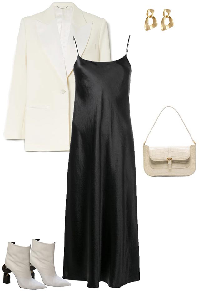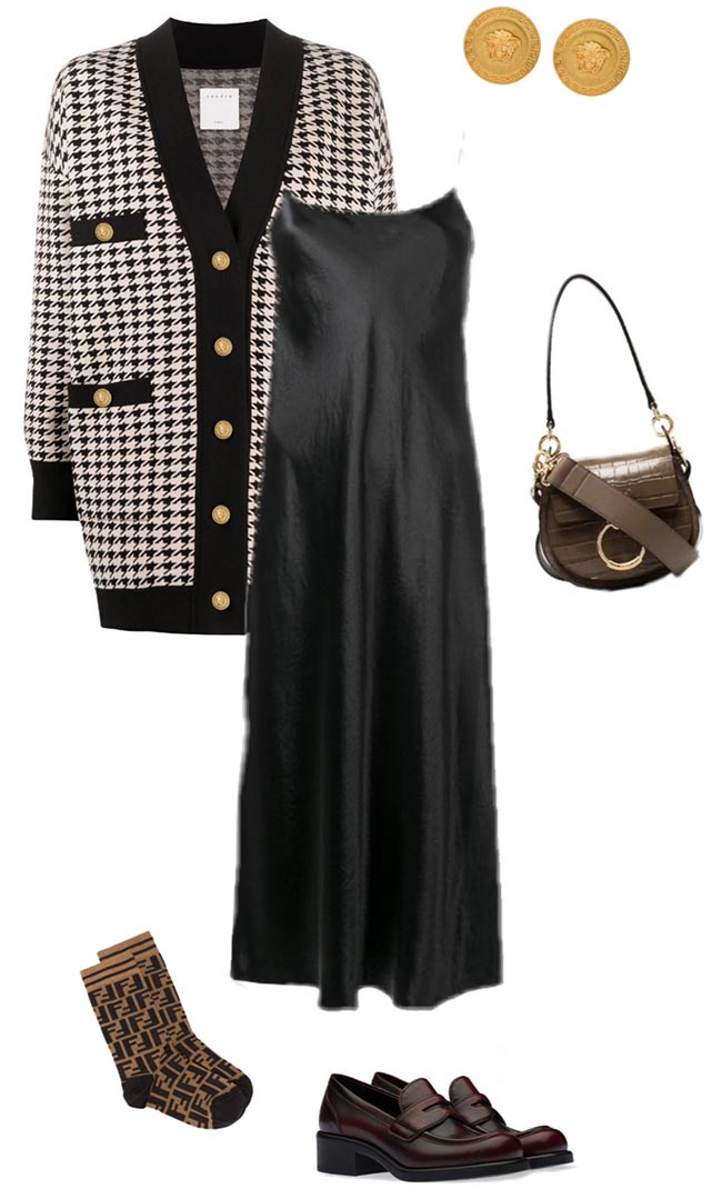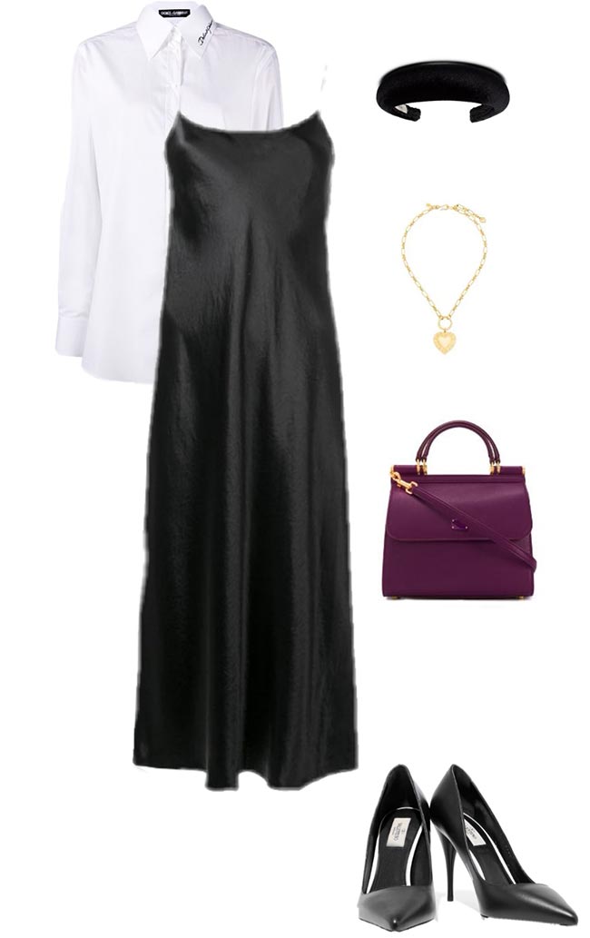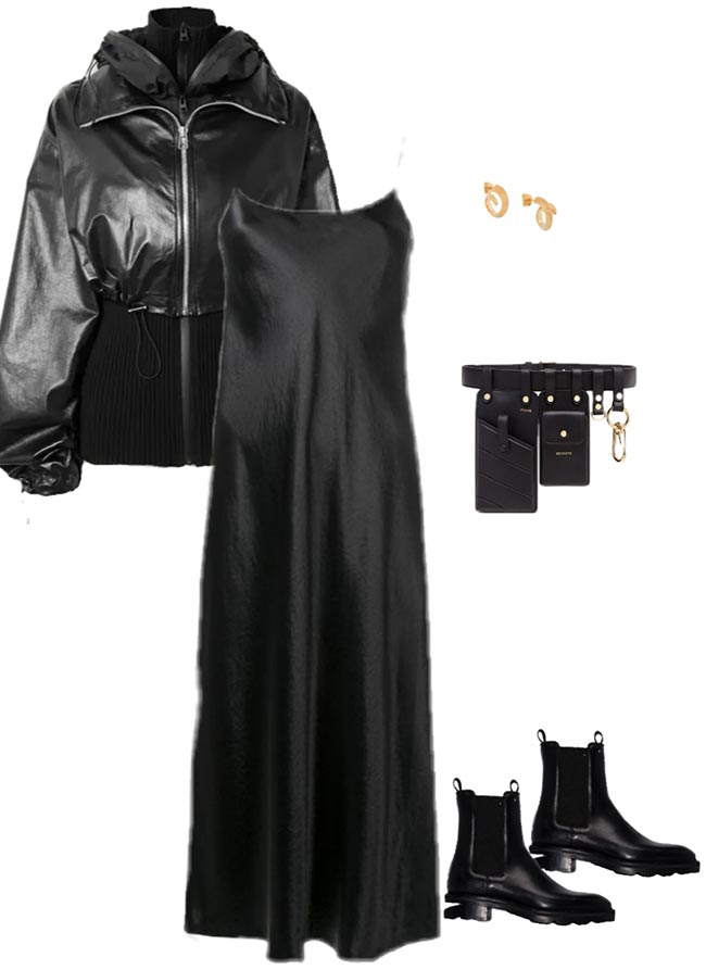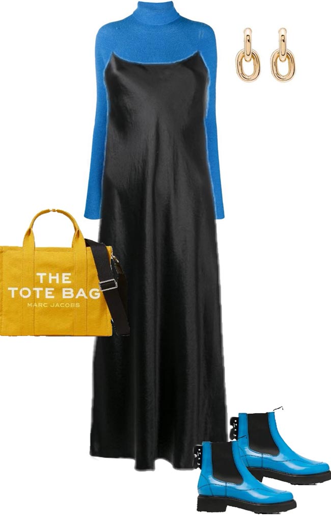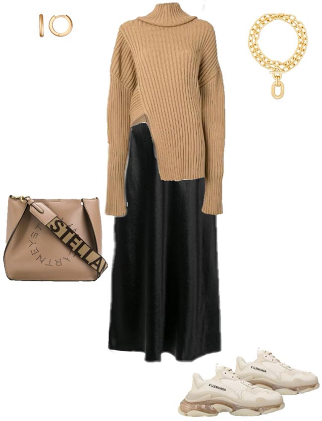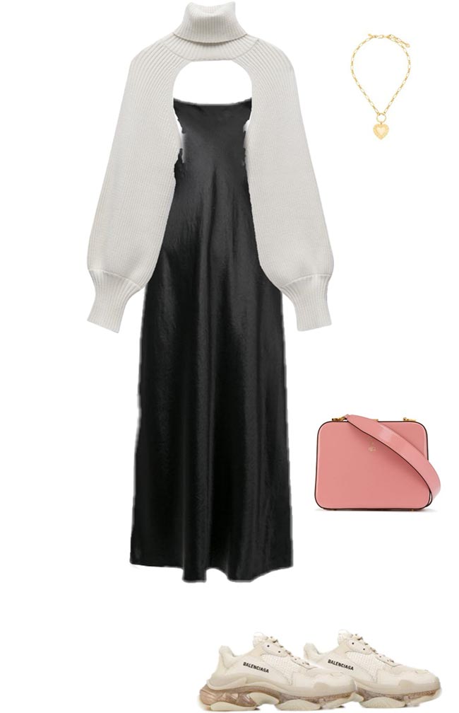 Associée à un pull asymétrique, cette robe est incroyablement élégante. Mais vous pouvez aussi prendre n'importe quel pull oversize et le compléter avec une ceinture. Des baskets et un sac souple maintiendront l'ambiance détendue.