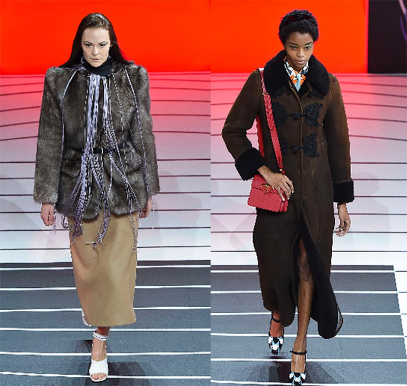 Prada ne diffère pas par l'originalité, attire l'attention du public d'âge avec des manteaux en peau de mouton et des manteaux de fourrure. Comment moderniser le look avec un manteau en peau de mouton ? Vous devez le ceinturer avec une ceinture et ajouter une écharpe et une longue frange.