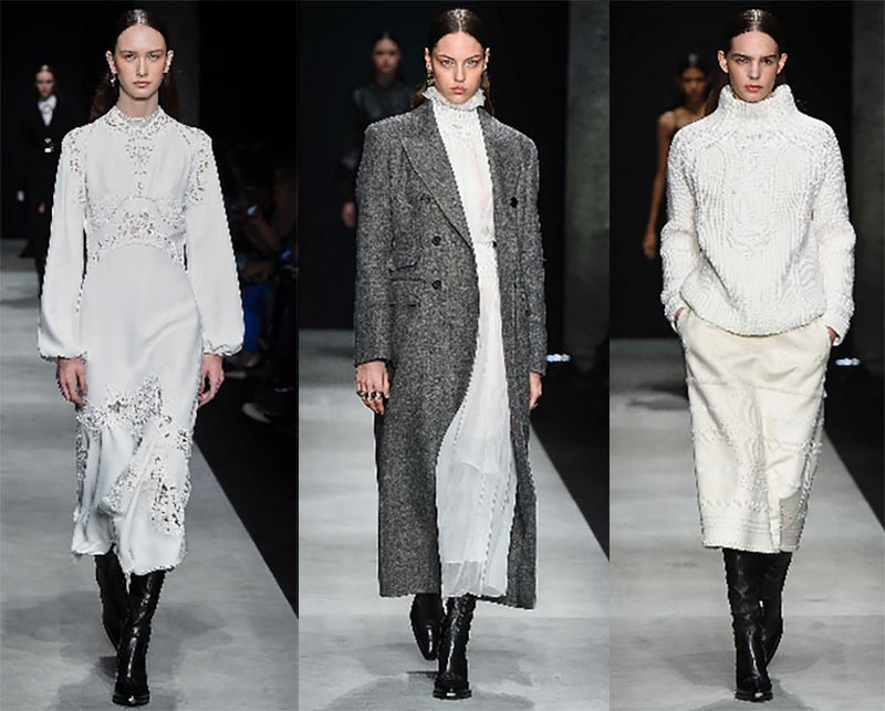 Si Dolce & Gabbana montre des ensembles en noir, Ermanno Servino plaît aux clients avec des looks blancs nobles. Les robes découpées, les pulls et les cols blancs, les jupes blanches combinées avec des chaussures noires sont luxueuses.
