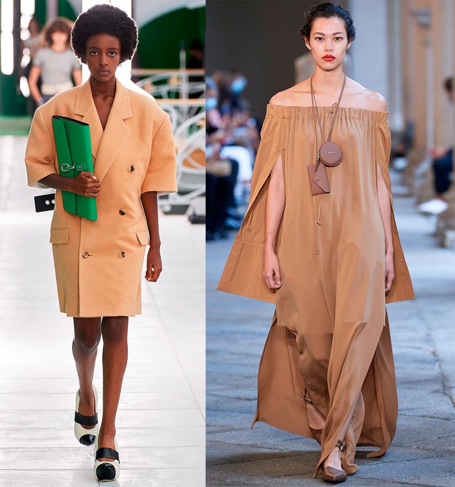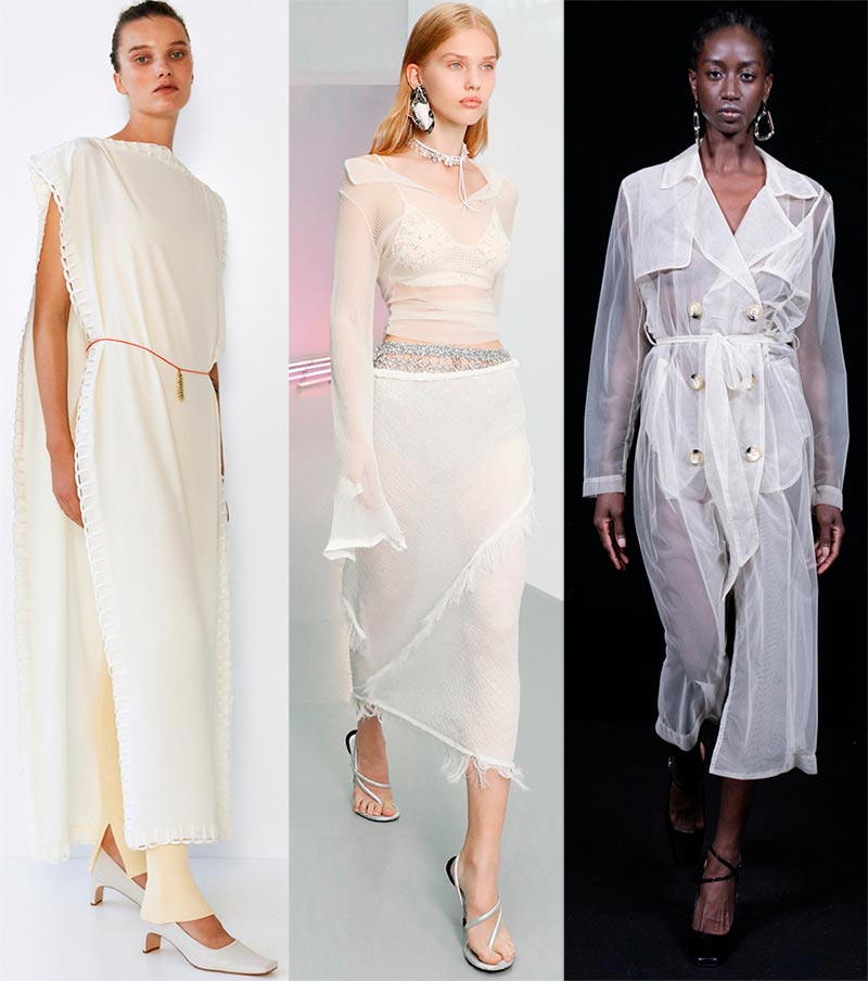 Voyons maintenant comment les créateurs ont habillé leurs modèles féminins dans des tenues blanches et crème sophistiquées et légères. Elle est quelque peu différente de la crème au beurre, sa couleur est légèrement plus froide et plus transparente, Pantone appelle cette couleur "plus claire que l'air".