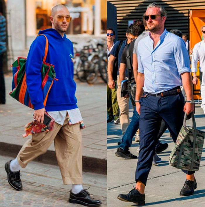 Le plus souvent, les sacs pour hommes complètent les looks dans un style professionnel. Dans les rues des capitales à la mode, des hommes en costumes classiques et extravagants s'affichent avec des sacs enveloppes, des porte-documents et des bretelles à la main. Et les fashionistas dans des tenues décontractées portent de la bonté dans des sacs ceinture et des cabas.