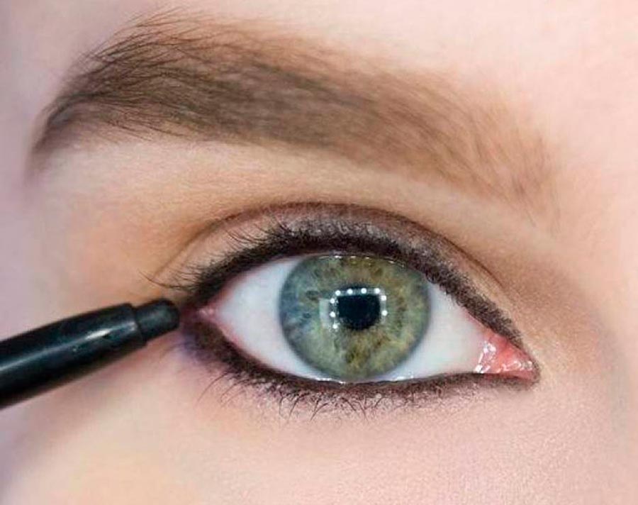 4. L'éclaircissement de la membrane muqueuse de la paupière inférieure augmentera également visuellement la taille des yeux. La ligne doit être tracée avec un crayon de couleur claire - beige, olive, etc. Seulement, s'il vous plaît, n'utilisez pas de crayon blanc à ces fins, vous risqueriez donc d'obtenir une fille d'anime dessinée (et, au sens littéral du mot) au lieu d'une beauté luxueuse, car la couleur blanche sur la membrane muqueuse inférieure semble étrangère .
