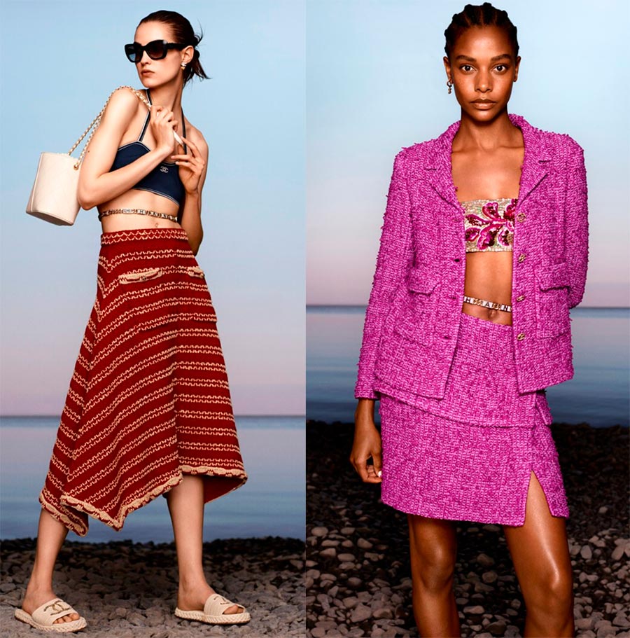 Bando... Idéal pour les filles avec de petits seins. Ceux-ci peuvent être des corsages en forme de tissu à rayures, avec ou sans bretelles, des versions torsadées du style Victoria Secret. Ces bikinis s'adaptent confortablement, ont fière allure, rendant la silhouette plus féminine. Un grand imprimé et des nuances claires feront l'affaire pour ajouter visuellement du volume à la poitrine, si vous en avez besoin. Des hauts de ce type figuraient dans la collection croisière Chanel 2026.