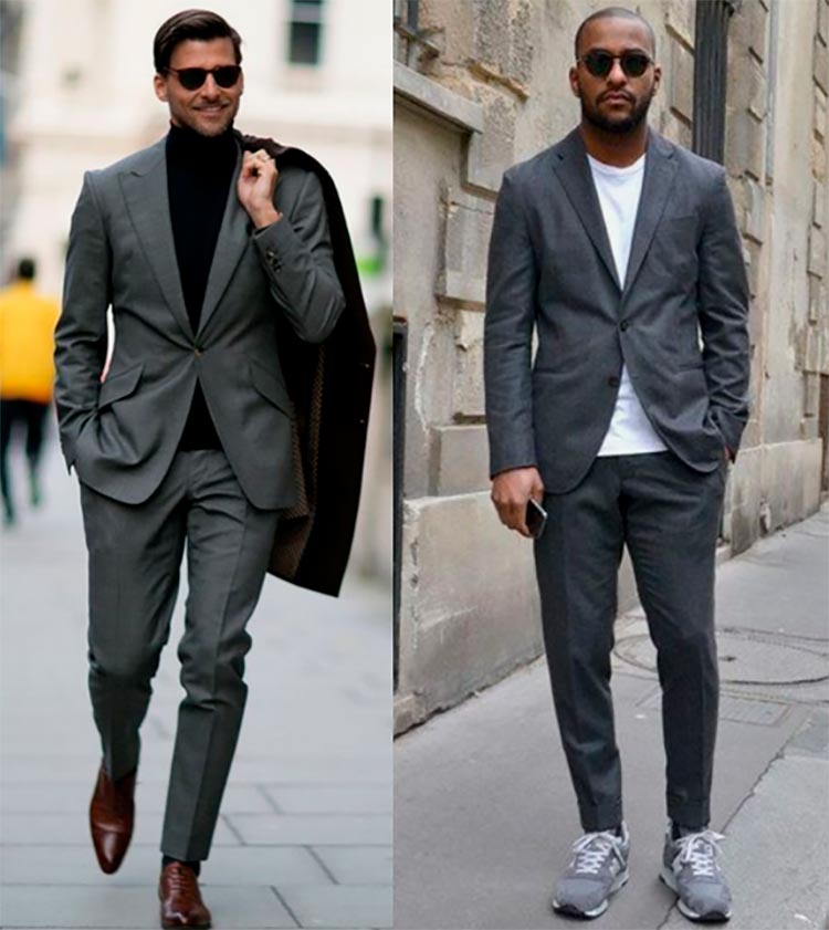 Costumes gris Un costume gris n'a pas l'air formel. Le modèle est adapté à un usage quotidien. Se marie bien avec un t-shirt blanc et un col roulé noir.