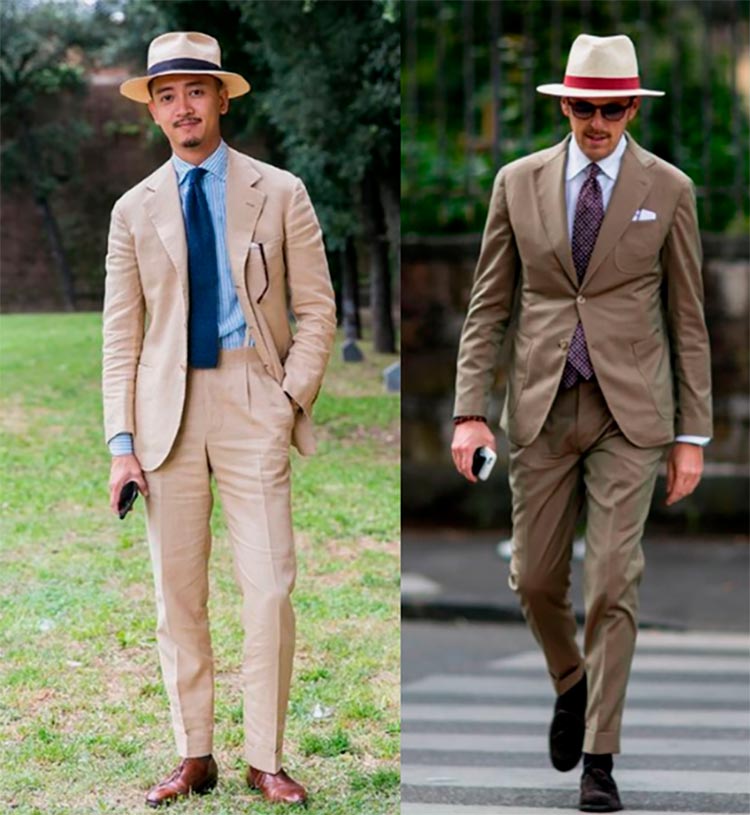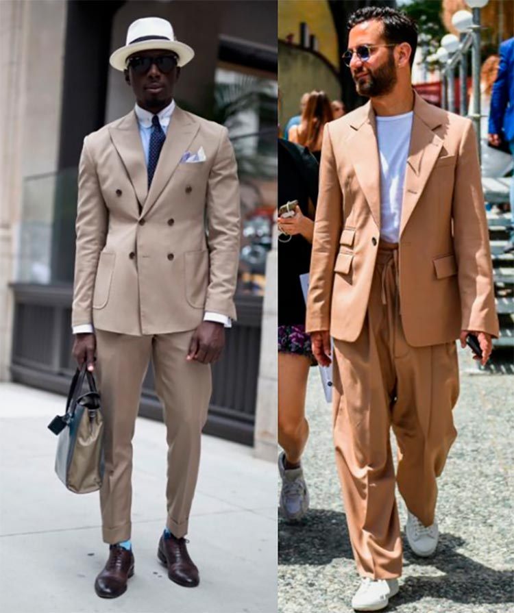 Costumes beiges La couleur beige est parfaite pour un costume d'été pour tous les jours. La couleur est neutre, elle se combine donc avec n'importe quelle couleur en termes de saturation et de chaleur.