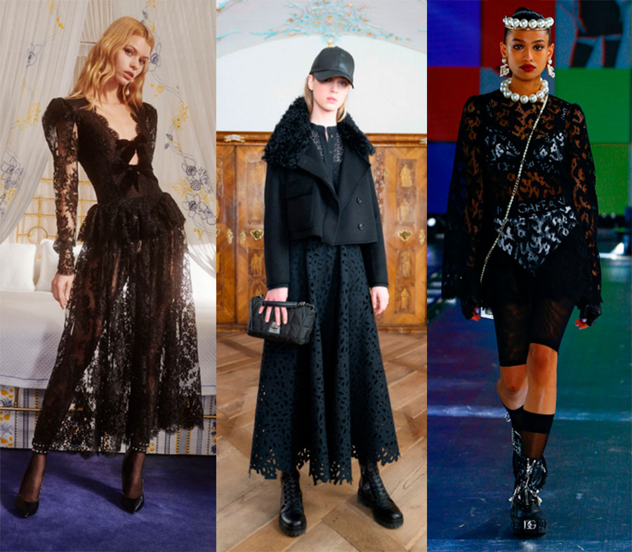 Fondamentalement, ce sont des robes en dentelle noire, moins souvent - dentelle et guipure sur les chemisiers. La transparence en tant que tendance est également un fil conducteur de toutes les impressions. Collections : Alessandra Rich, Dolce & Gabbana, Akris.
