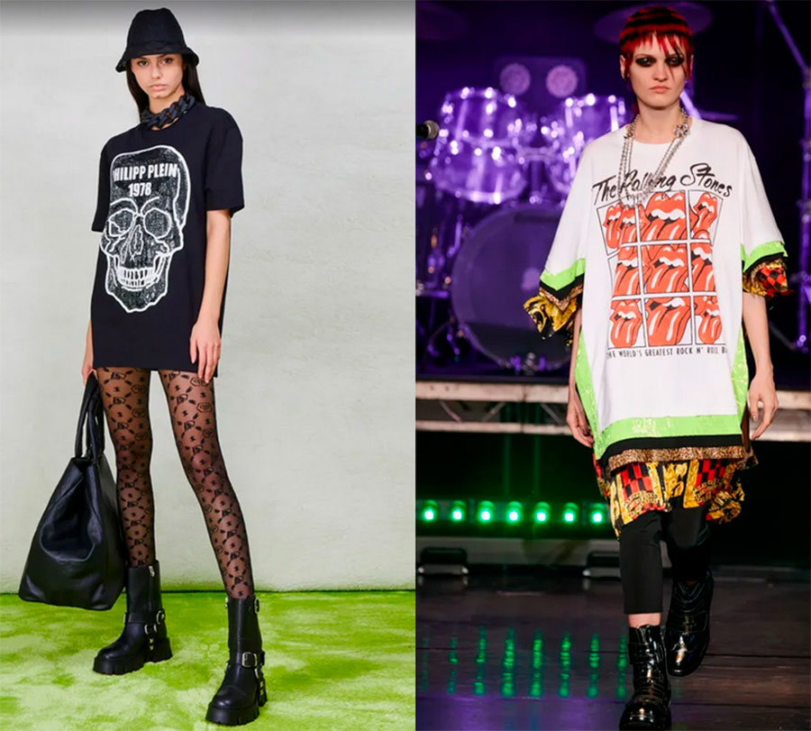 Les t-shirts à épaule d'homme - grands, unis ou imprimés - sont à la mode. Il est pratique de porter de telles choses avec des bottes grossières, des leggings ou des collants en résille.