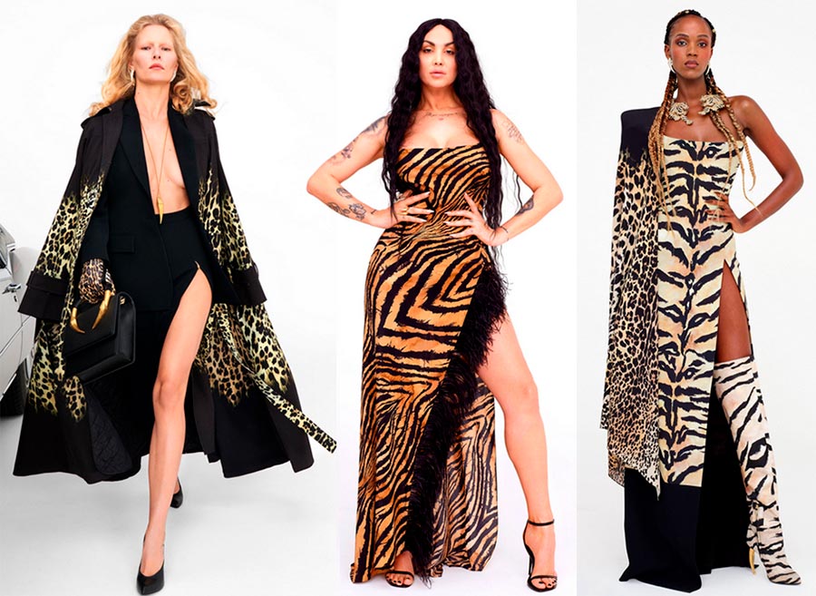 Roberto CavalliDétails : décolleté, imprimé animalier, plumes, épaules ouvertes, coupe haute, bottines.