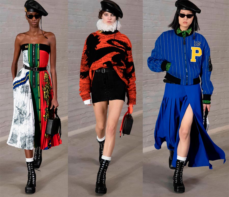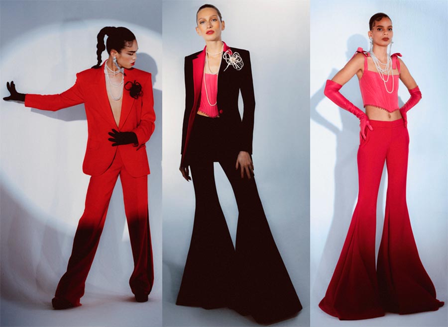 Prabal gurungDétails : rouge, rangs de perles, cheveux lissés, costumes, hanches moulantes, corsets, gants.