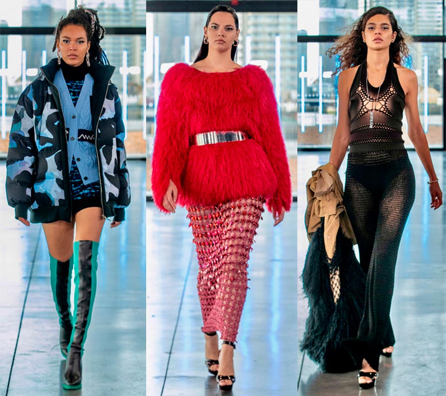 LaQuan SmithDétails : bas et haut en cuir verni, corsets, jupes asymétriques.