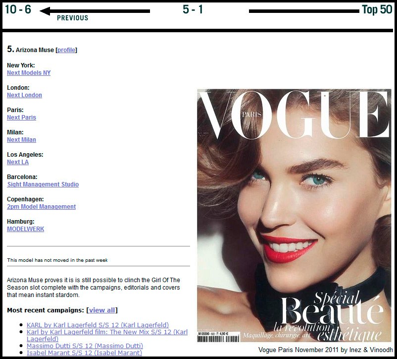 Puis elle a donné naissance à un enfant, s'est teint les cheveux, et en 2010, étant une brune aux cheveux courts, Arizona a attendu sa plus belle heure et la popularité et les contrats lucratifs ont commencé à lui arriver. Dans le monde de la mode, c'est d'une grande importance - être capable d'attendre une opportunité et d'utiliser l'opportunité le plus rapidement possible.