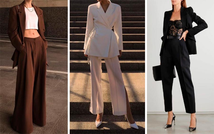 Pendant la saison froide, en choisissant entre une jupe et un pantalon, le choix se porte le plus souvent en faveur de ce dernier, puisque vous pouvez porter des sous-vêtements thermiques sous eux pour que vos jambes restent toujours au chaud. L'anti-tendance au pantalon peut être attribuée aux pantalons de type costume de coupe droite, avec ou sans flèches repassées, jusqu'au milieu du talon. Ces pantalons sont souvent accompagnés ou non de vestes à simple boutonnage à un bouton.