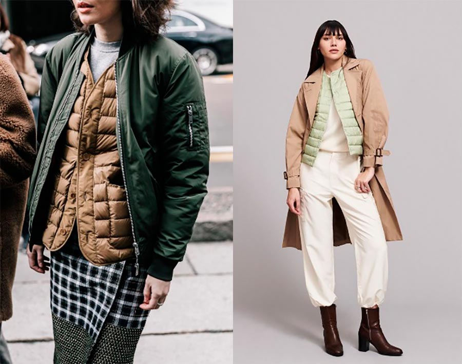 Pour les amateurs d'un mode de vie actif, un gilet bouffant peut également être une base. Ici, il est important de se rappeler une coupe libre, ne choisissez pas des gilets ajustés. Les gilets très fins sont mieux utilisés comme doublure pour l'isolation sous un trench-coat ou un manteau.