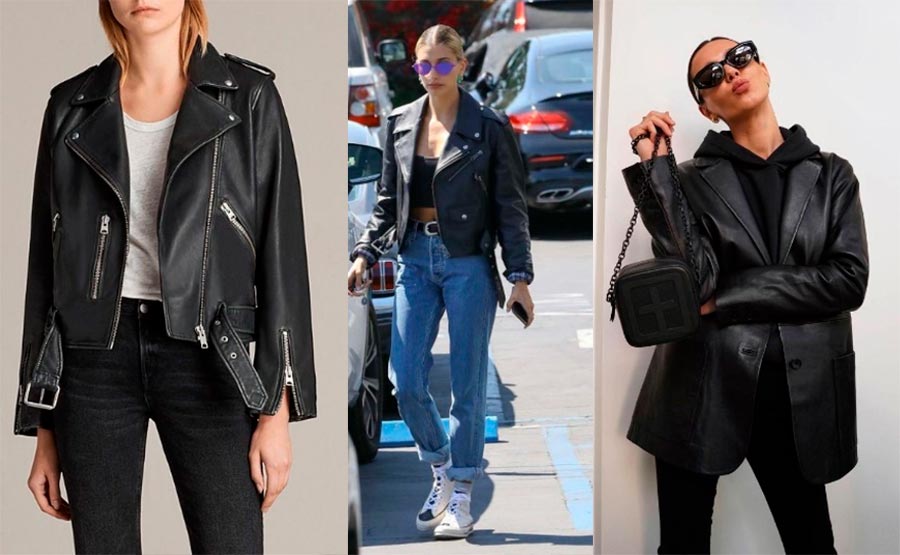 L'exemple principal d'un modèle actuel est une veste de motard en cuir de coupe droite, sans aucun détail inutile. Cette veste vous servira plus d'une saison et s'intégrera au mieux dans votre garde-robe. Si soudainement vous ne voulez pas de veste en cuir, alors vous pouvez faire attention à une veste en cuir. Il jouera bien en contraste avec d'autres textures de l'image, telles que les tricots, la laine ou même la soie.