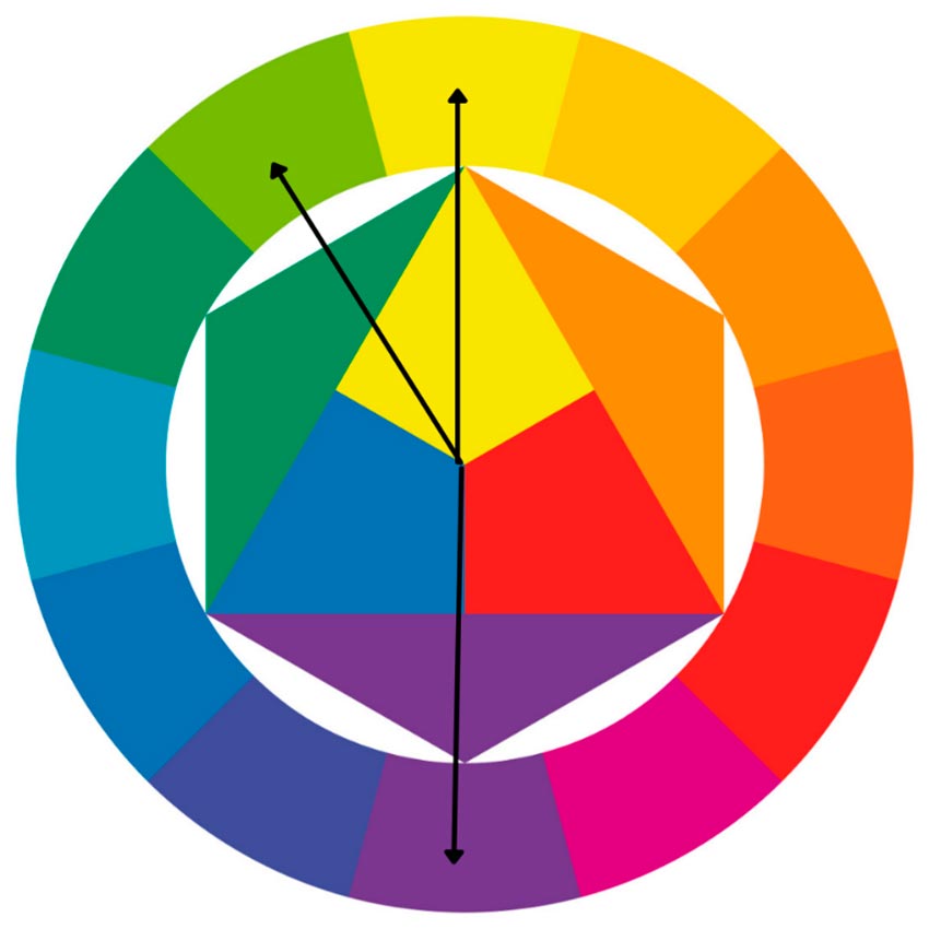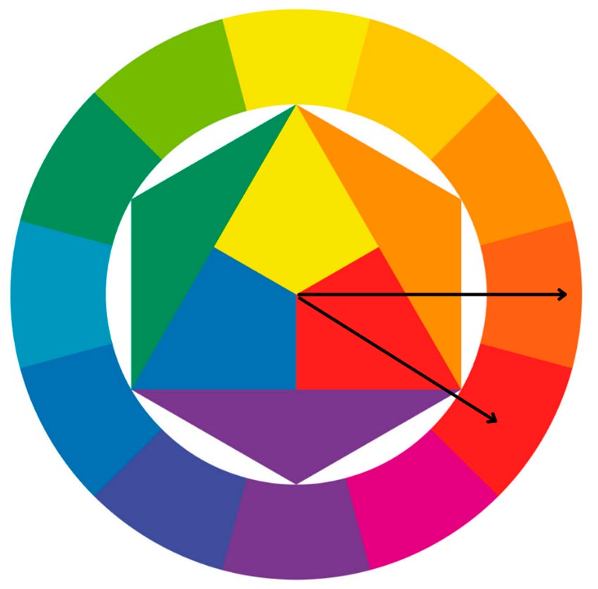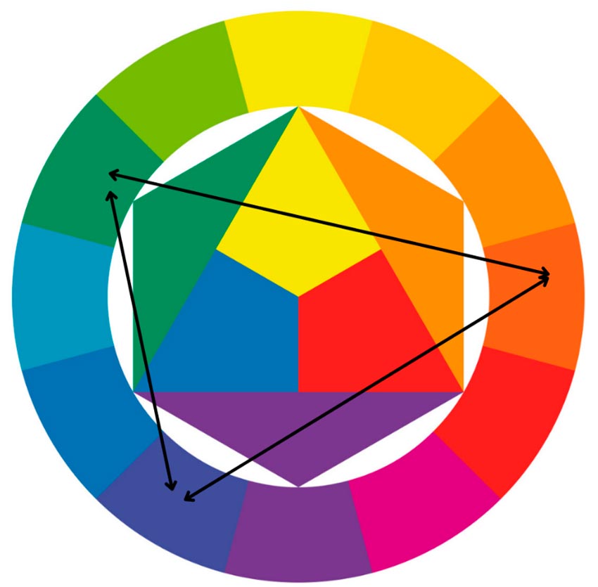 - Triade - trois couleurs vives provenant de secteurs proches du cercle, deux couleurs similaires et une couleur opposée ou trois couleurs également distantes. Par exemple, violet, rose et vert, ou jaune, rouge et bleu.