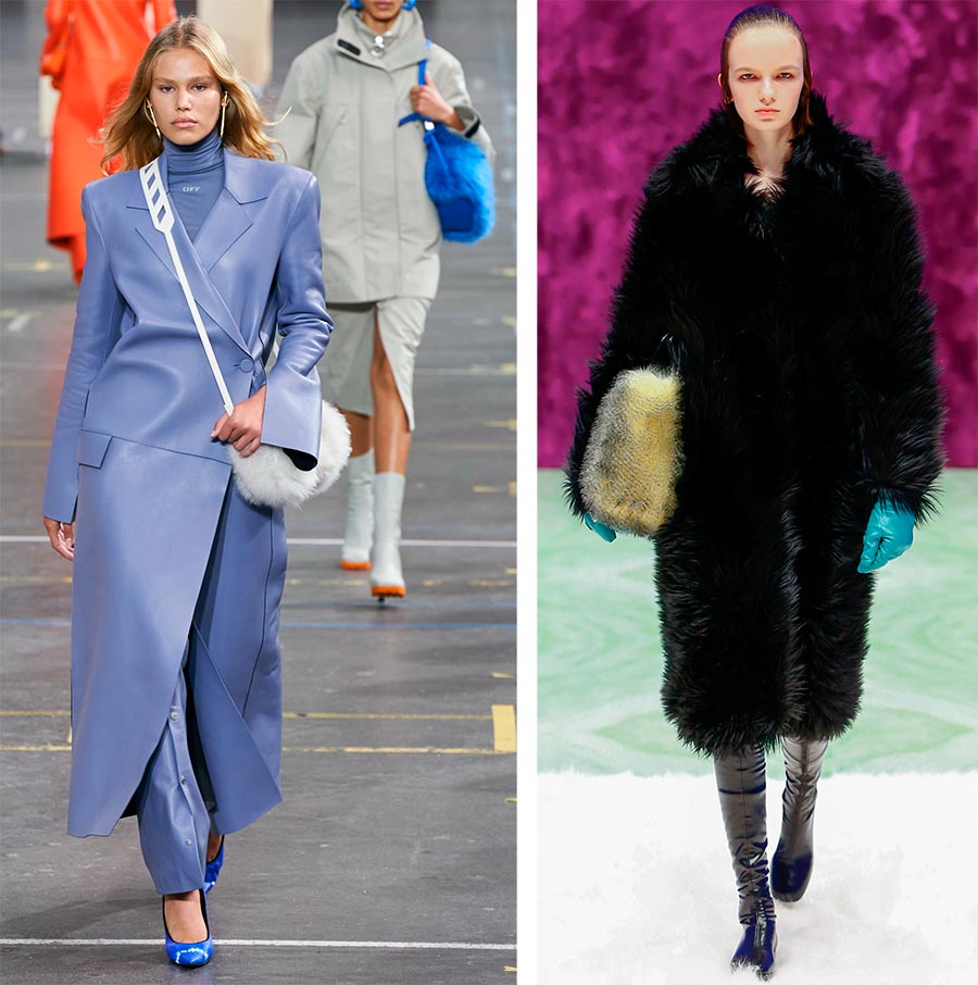 La fourrure est pertinente non seulement pour les vêtements d'extérieur, mais aussi comme élément décoratif sur les sacs. Maintenant, les concepteurs s'éloignent de l'utilisation de la fourrure naturelle et préfèrent l'artificiel. Dans leurs collections, la fourrure était utilisée par des maisons de couture telles que : Fendi, Prada, Givenchy, Off-White, Jacquemus, Chanel.
